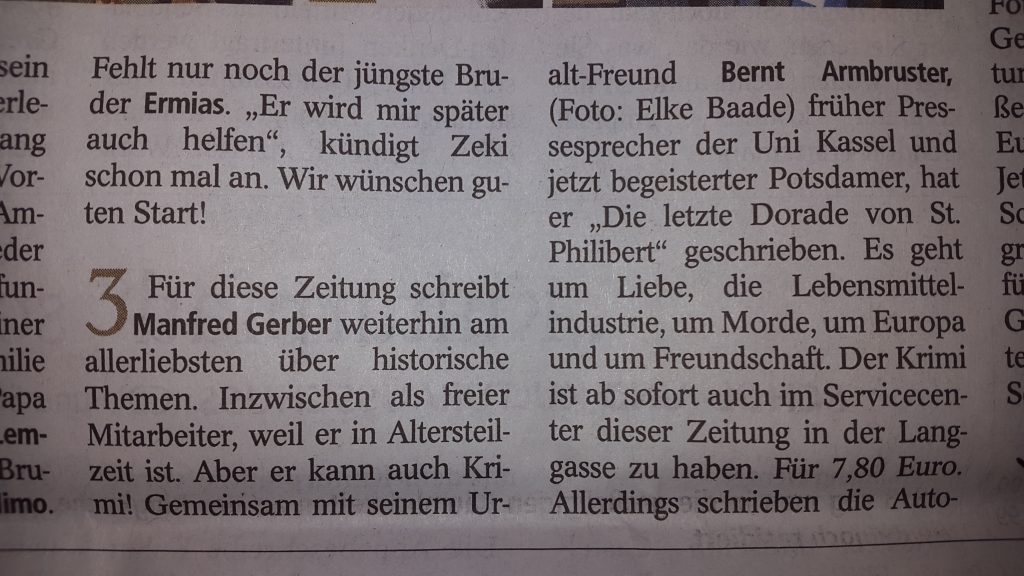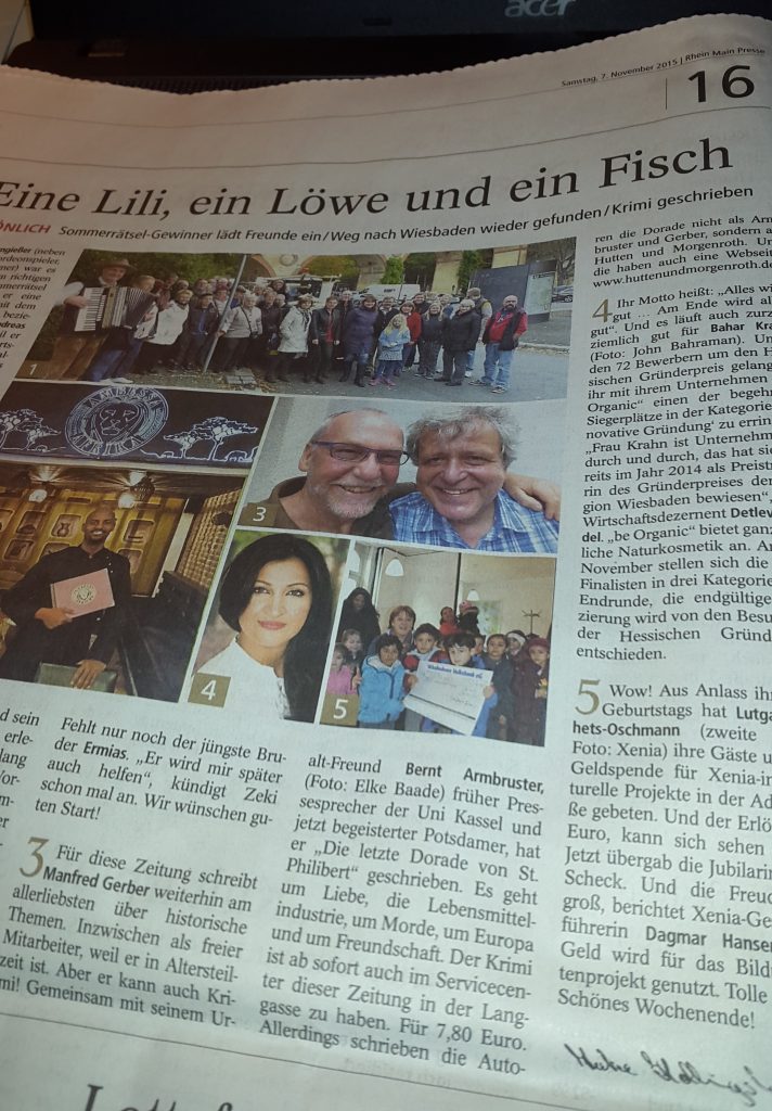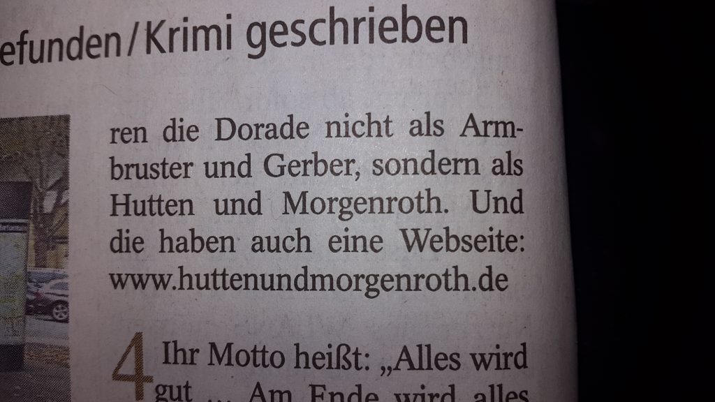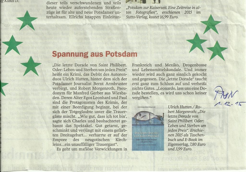 Mit Robert Morgenroth, dem Wiesbadener Autor im Zweierteam, werde ich mir keine Dorade bestellen – gern aber mit dem Kollegen, der sich hinter diesem Pseudonym versteckt: Manfred Gerber, langjähriger Lokalredakteur und -historiker dieser Zeitung, hat gemeinsam mit seinem Freund Bernt Armbruster (Potsdam) sein erstes fiktionales Buch geschrieben. Gerbers Sachbücher, etwa zu Kurhaus oder Wiesbadener Kirchen, sind hier ja hinlänglich bekannt.